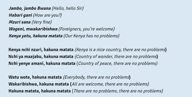 Lagið sem stúlkurnar syngja er á svahílí og kallast Jambo Bwana. Þetta er upprunalega kenískt lag sem hljómsveitin Them Mushroom sendi frá sér árið 1982. Lagið varð afar vinsælt og hafa fleiri hljómsveitir flutt það, þ.á.m. Boney M. Ein útfærsla er gjarnan sungin fyrir fjallgöngumenn þegar þeir koma niður af Kilimanjaro en það er einnig vinsælt að bjóða ferðamenn velkomna með þessum grípandi tónum. Upprunalega útgáfan er þessi: